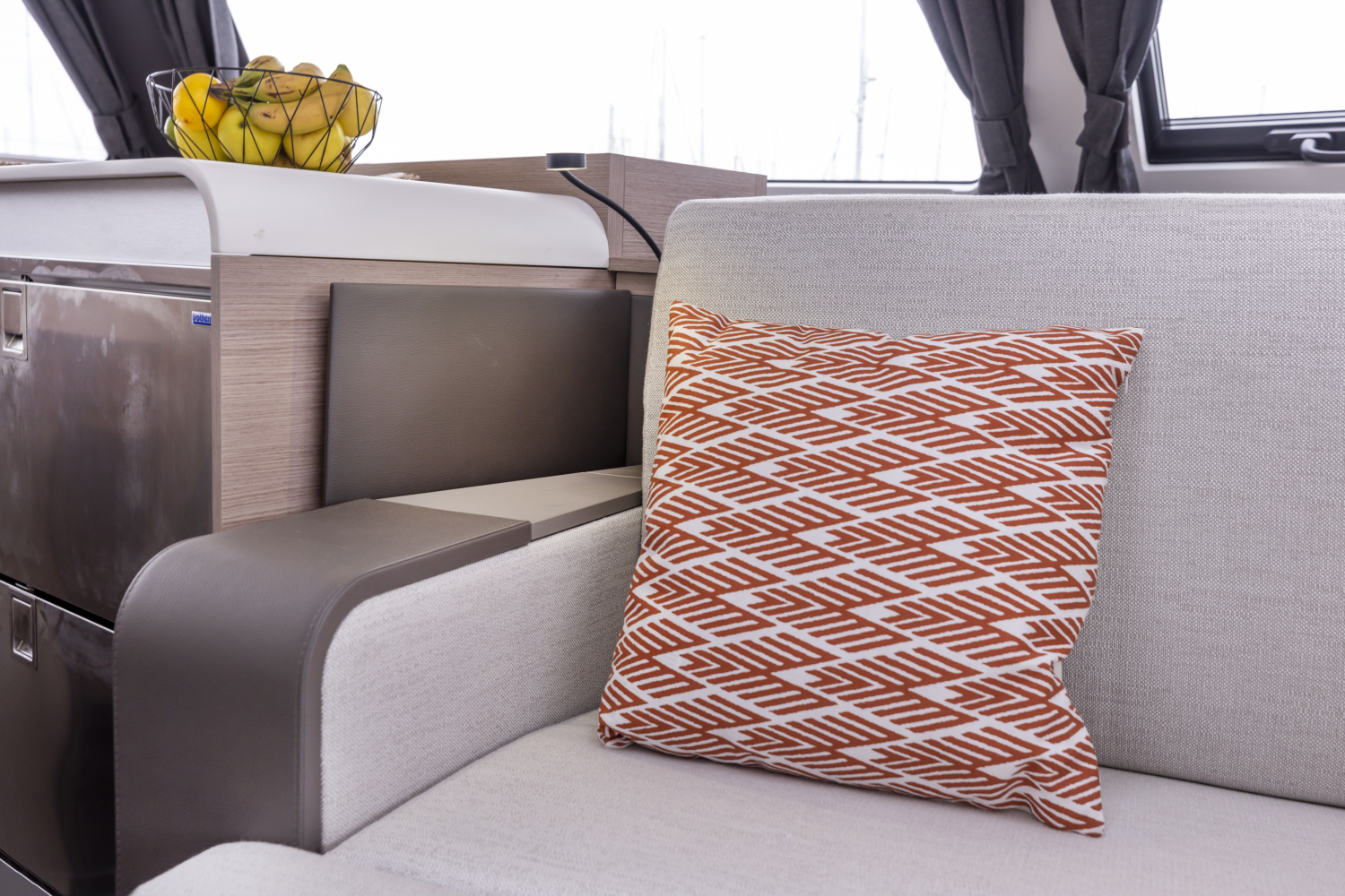 The Fountaine Pajot design office, in collaboration with the Olivier Racoupeau Design team of naval architects, imagined the Aura 51 to be able to accommodate a large surface area of solar panels without compromising on design.Its large flybridge, with its friendly lounge and sunbathing area, is fitted with solar panels that are totally flush-decked, integrating with the lines, capable of producing 2000 Watts of renewable energy. A successful gamble that allows the Aura 51 to generate 5 times more solar energy than other yachts equipped with solar panels.