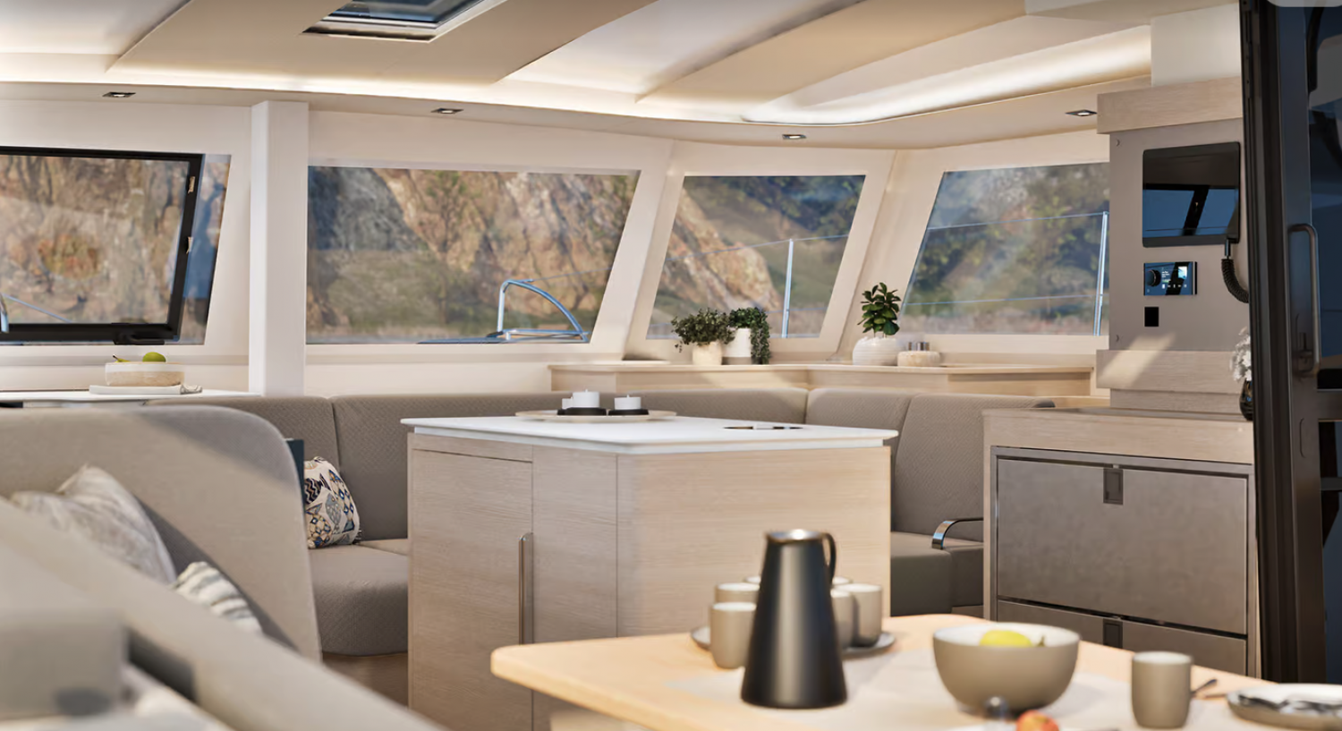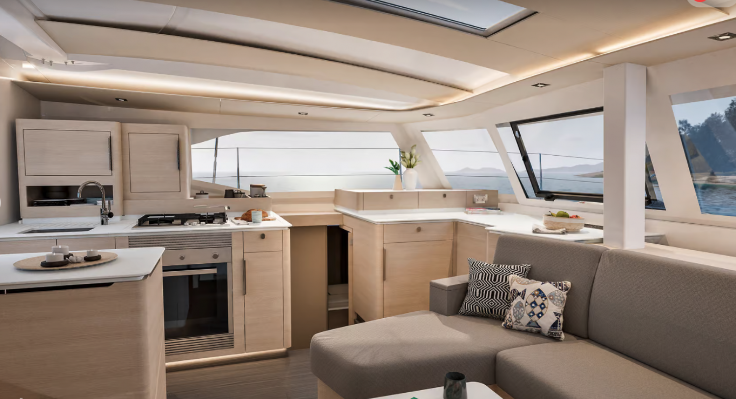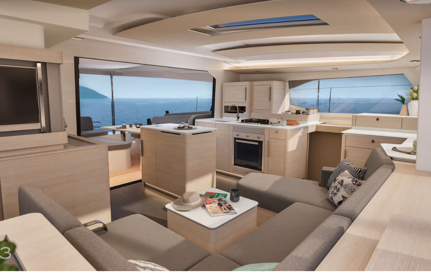 The enlarged nacelle offers even more volume and storage space. The New 44 catamaran also blurs the exterior/interior boundary with a fully opening window, a central island and a serving hatch at the front. Whatever the weather, you’ll always feel right at home when on board the Fountaine Pajot 44.