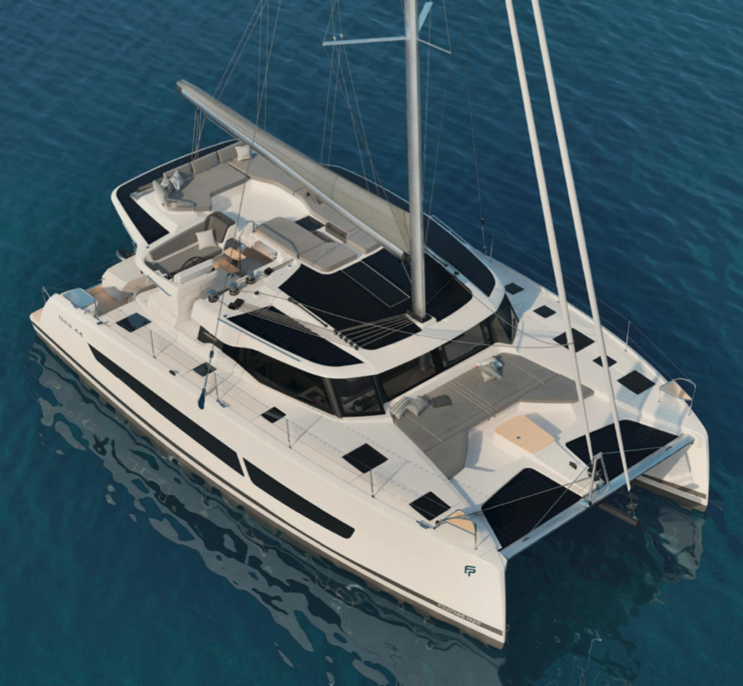 The discreet coachroof (albeit wider), the subtly inverted deck sheer, hull portholes highlighted by a stripe, a discreet chine above the waterline that’s extended as much as possible, and a sleek rig are all elements that guarantee not only good performance, but also elegance and balance of the Fountaine Pajot 44. From the very first tack you make, harmony is the natural order of the day: this perfectly optimised 44ft catamaran offers generous relaxation space in the cockpit, on the flybridge and forward of the coachroof. When it comes to sail manoeuvring, the deck layout of the FP44 remains faithful to the double manoeuvring/helm station that’s become such a favourite among users. Like all new Fountaine Pajot models, the New Fountaine Pajot 44 is available with our ODSea+ electric drivetrain and up to 2000W of solar panels.The FP44 has a maximum width opening onto the cockpit and central island
