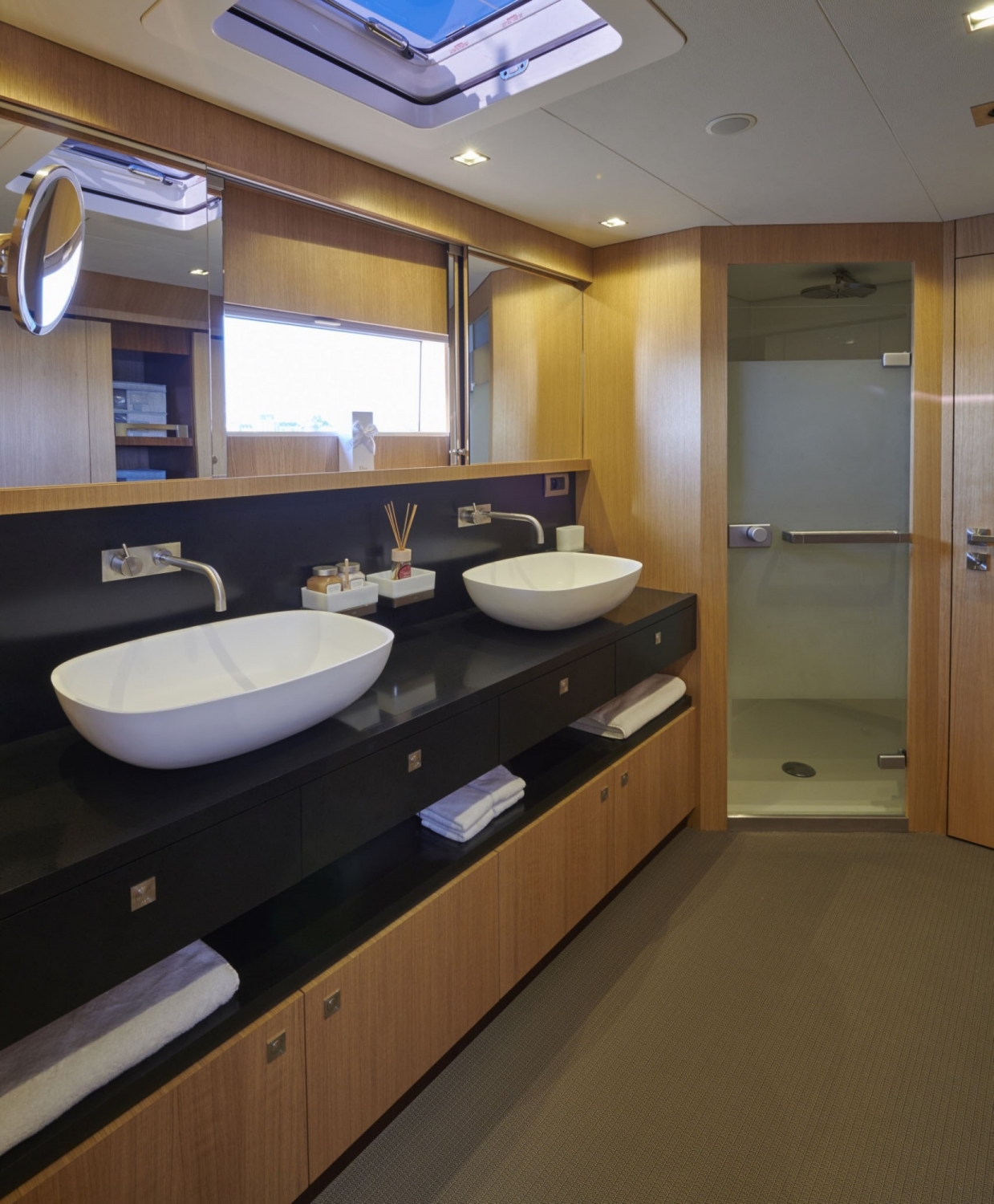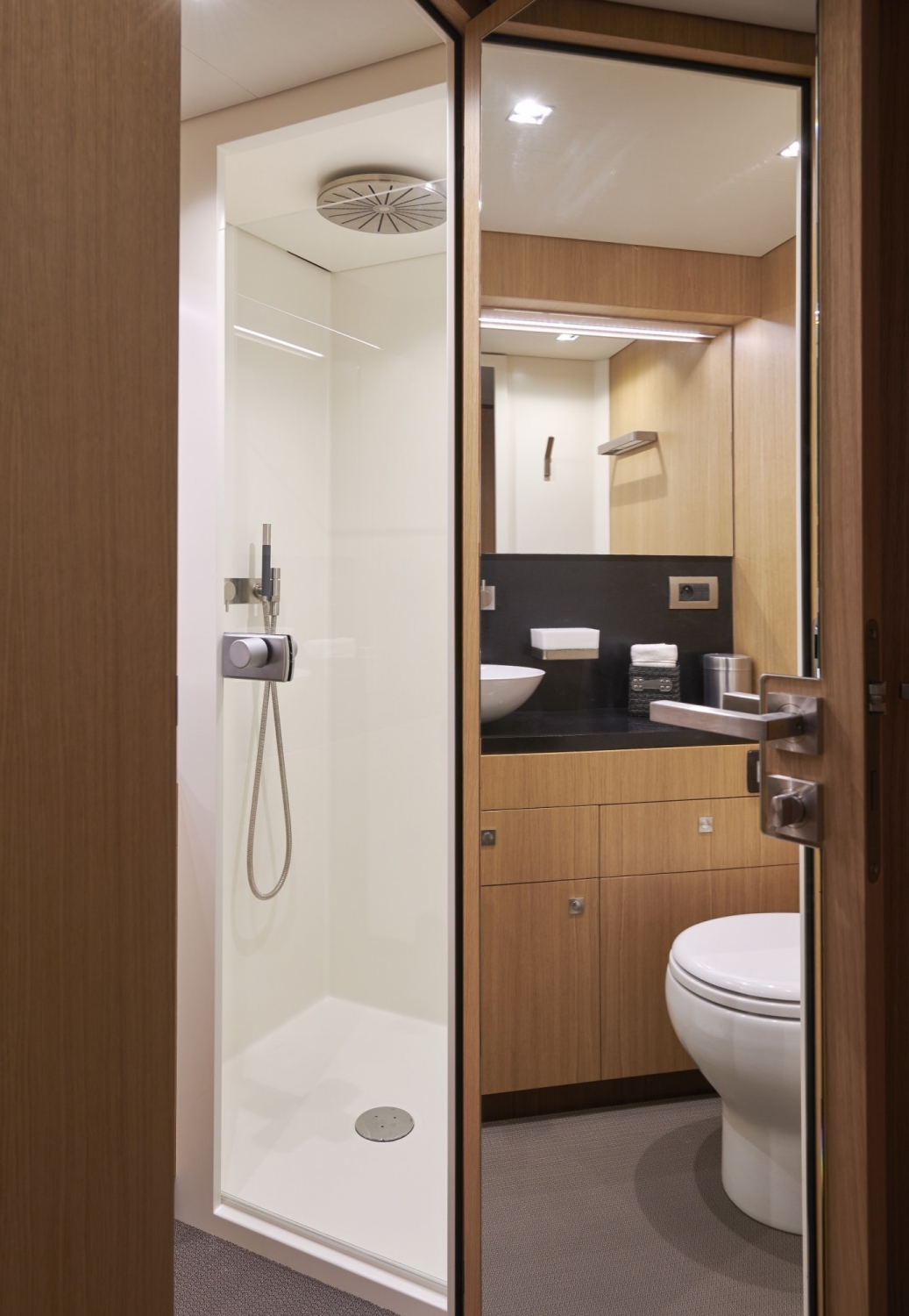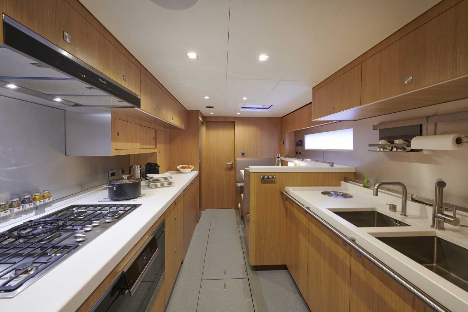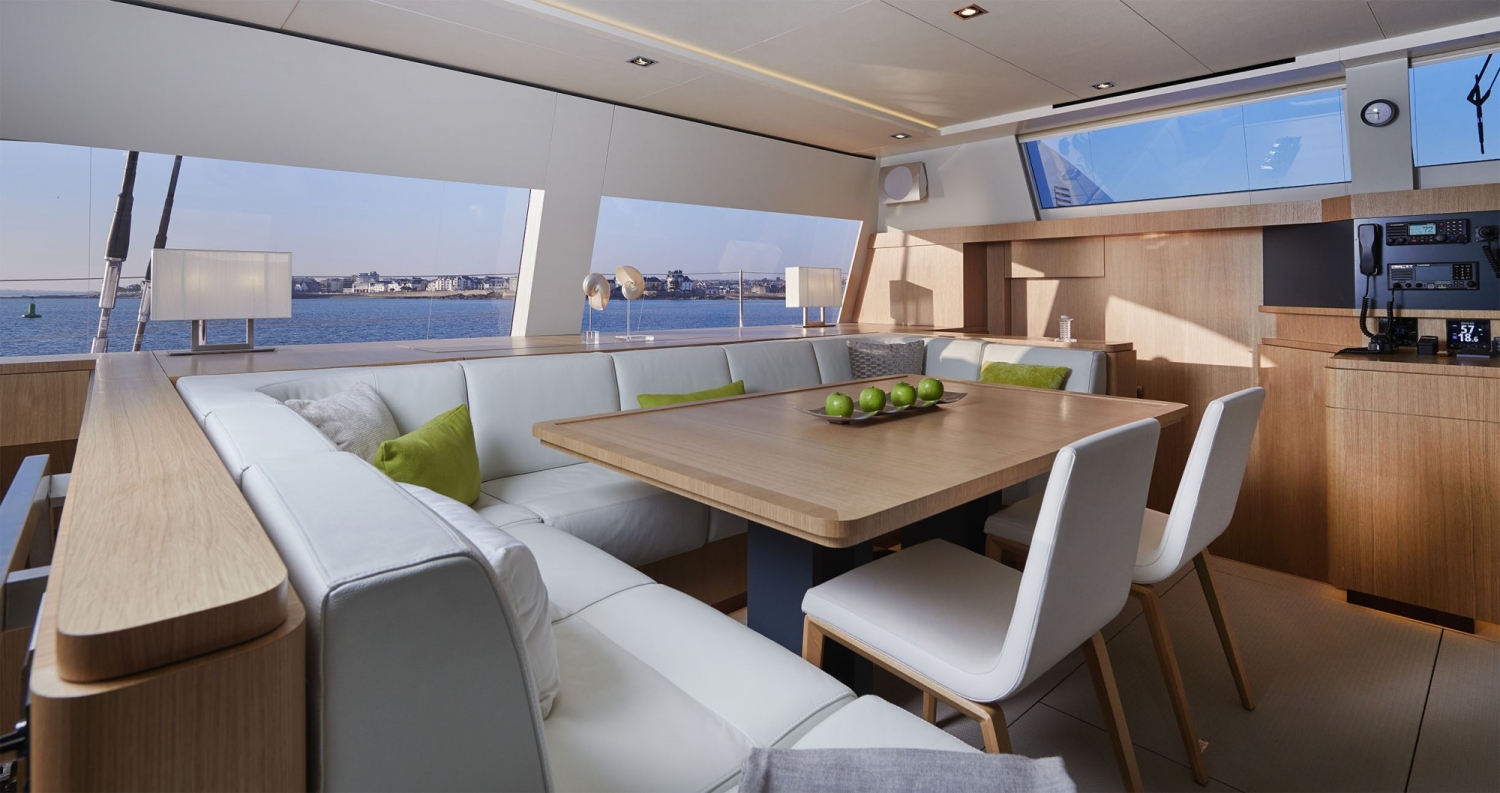 The cockpit is extended into the interior by a salon – a bar and lounge to starboard and a dining room on the port side. A navigation desk, up against the transverse bulkhead, connects the two spaces.