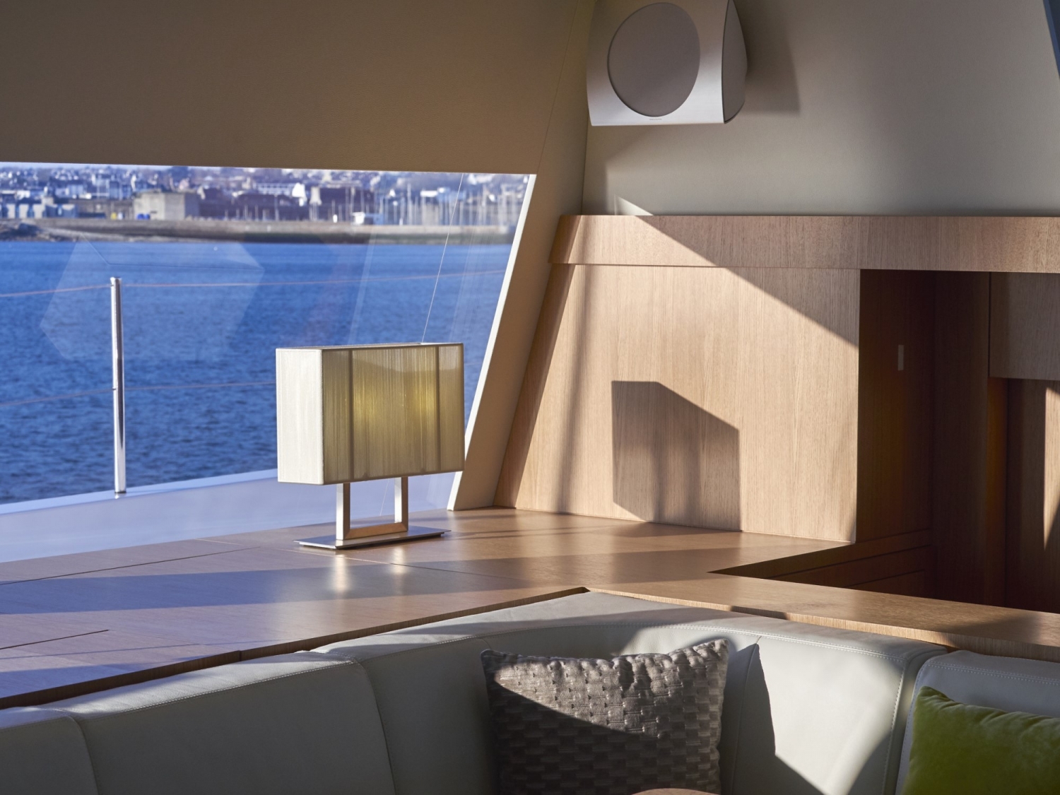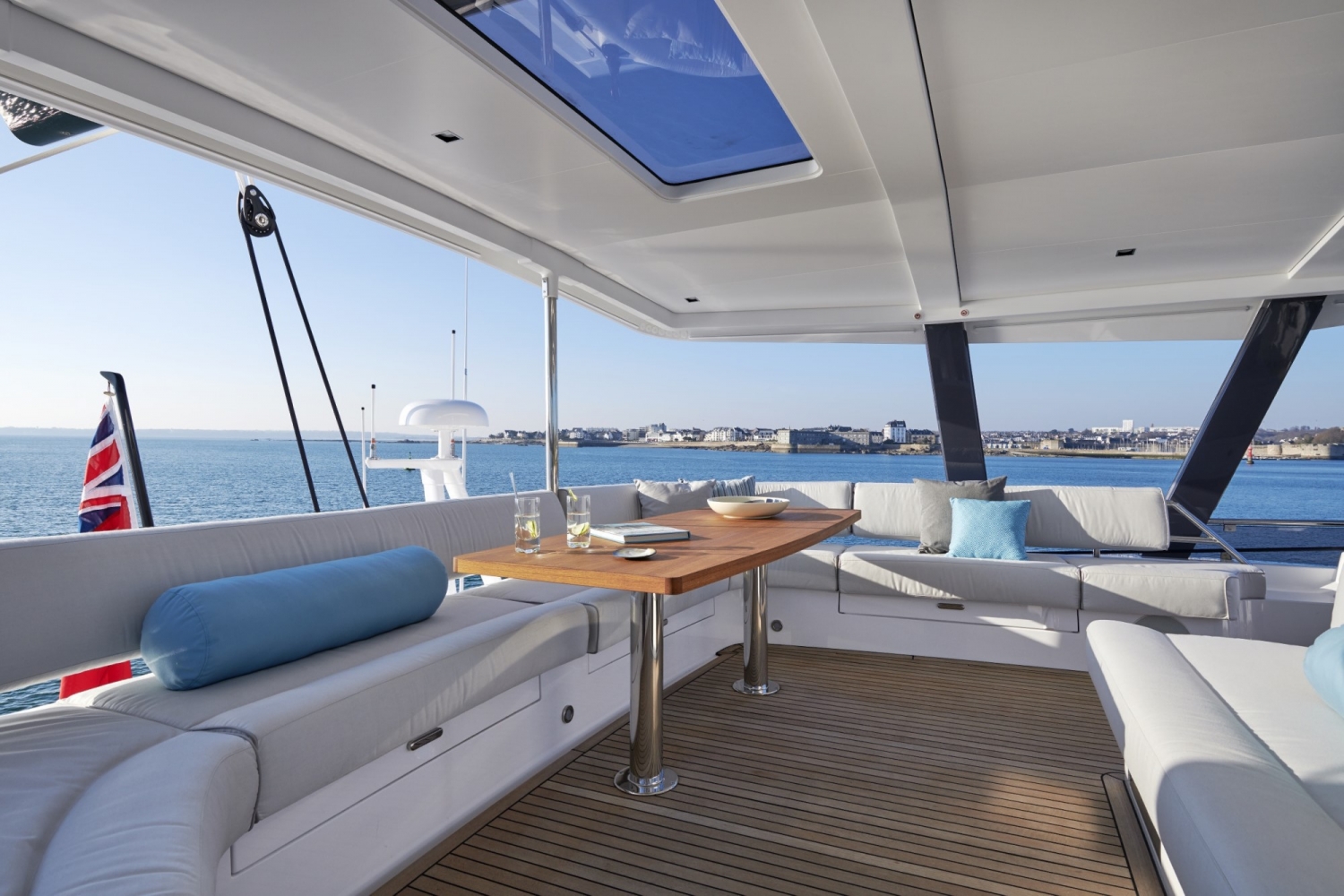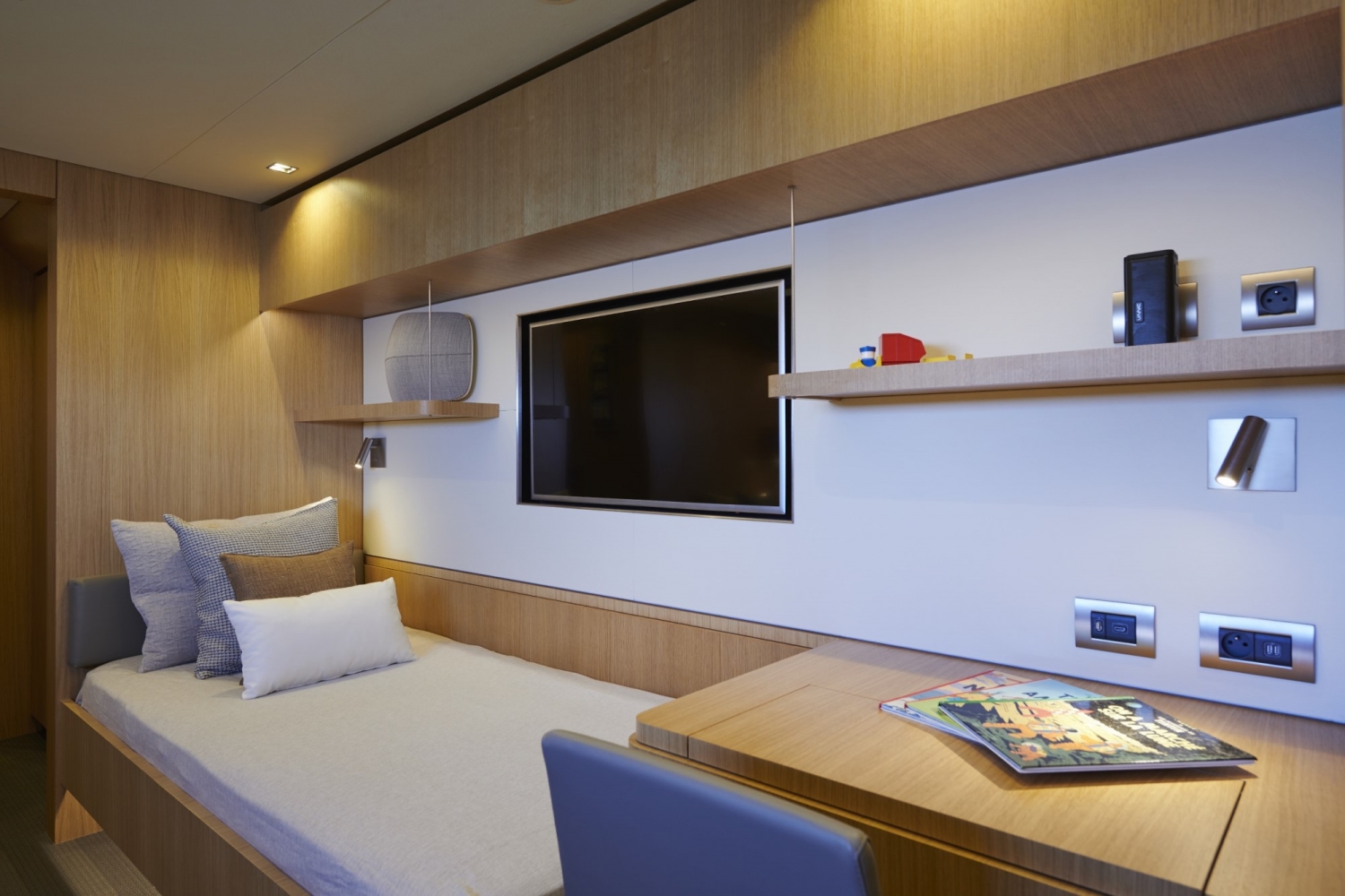 The cockpit is extended into the interior by a salon – a bar and lounge to starboard and a dining room on the port side. A navigation desk, up against the transverse bulkhead, connects the two spaces.
