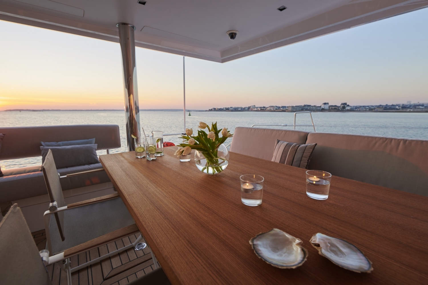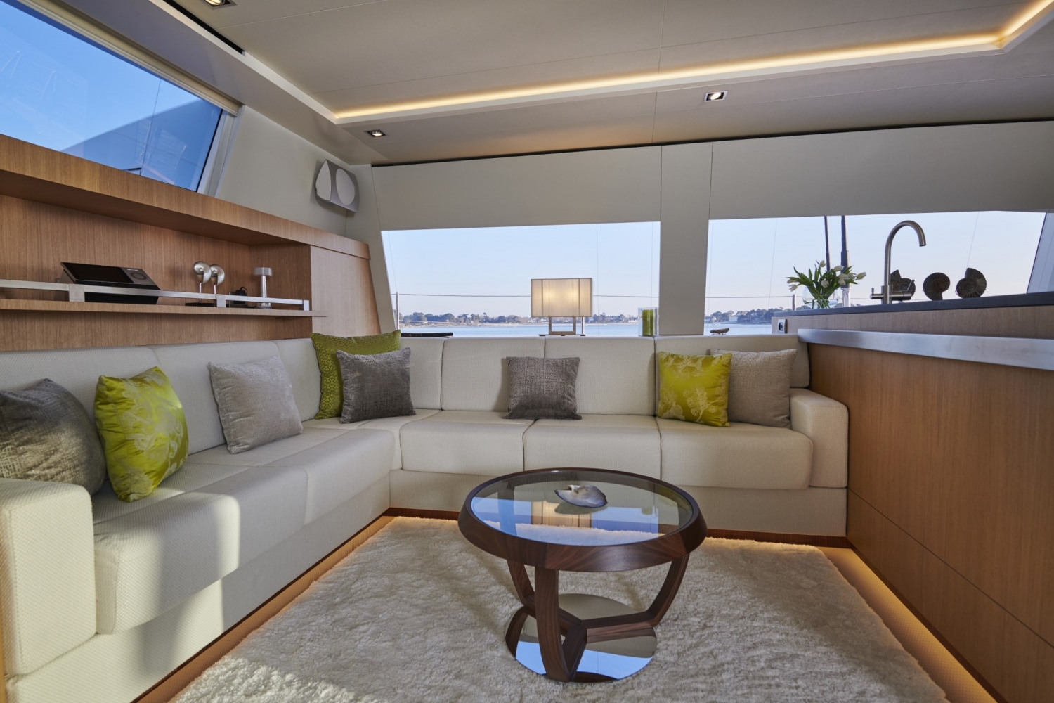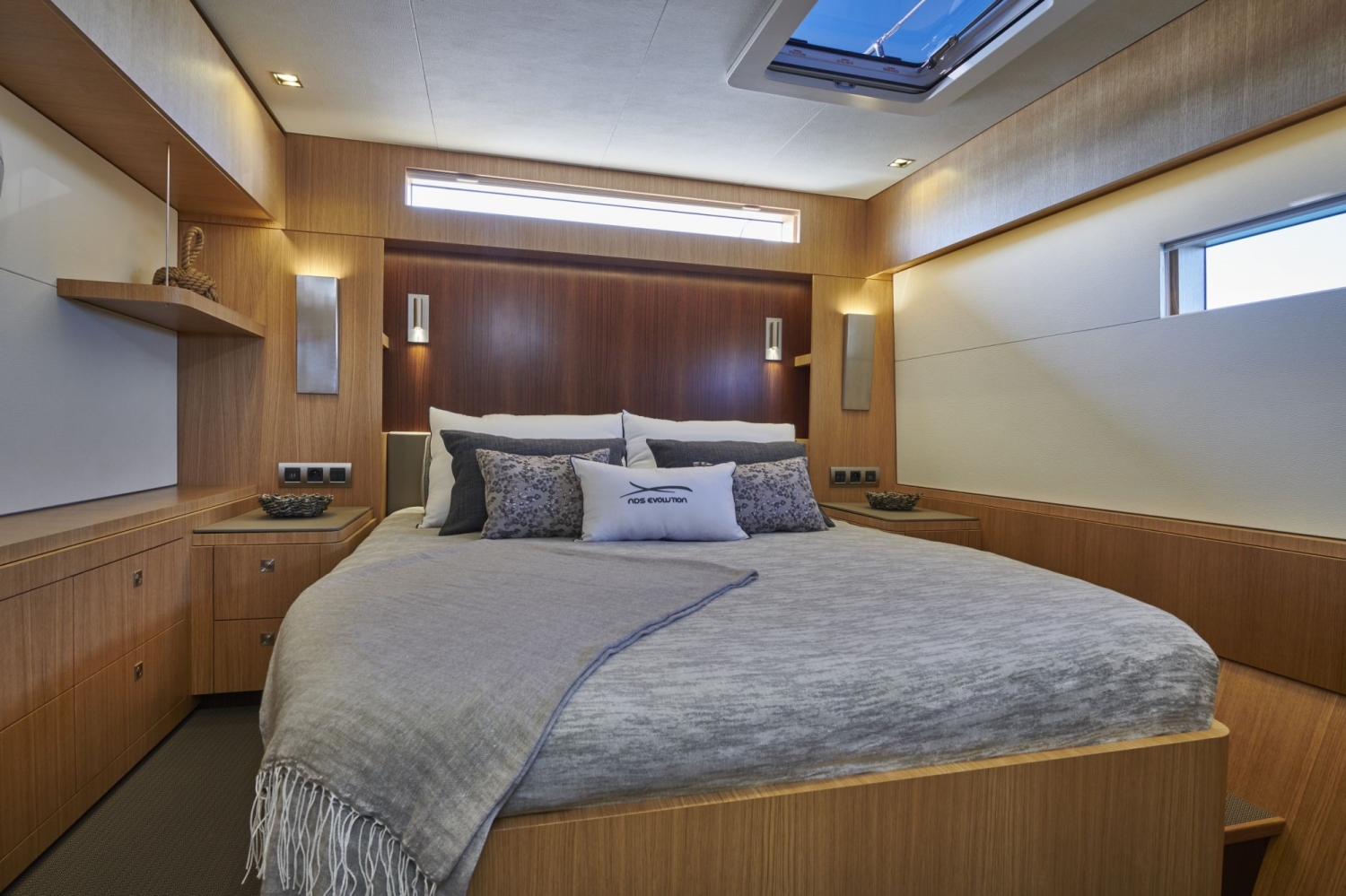 The owner’s cabin occupies the entire width of the boat, with its corner seating area, panoramic view, private access to the forward deck, and abundant natural light!