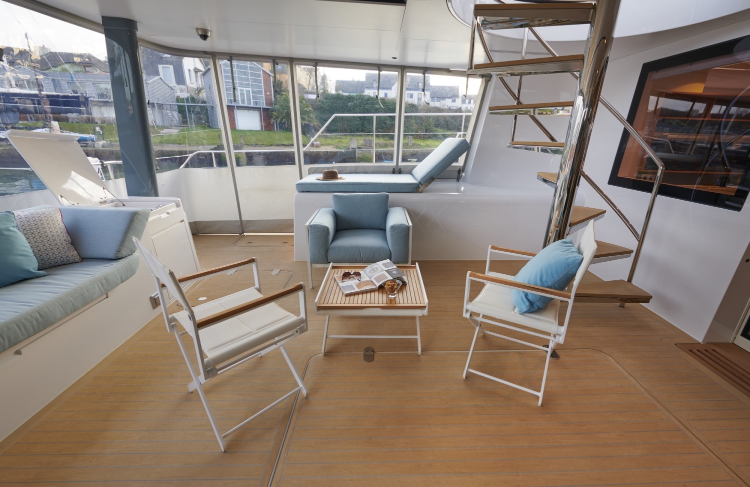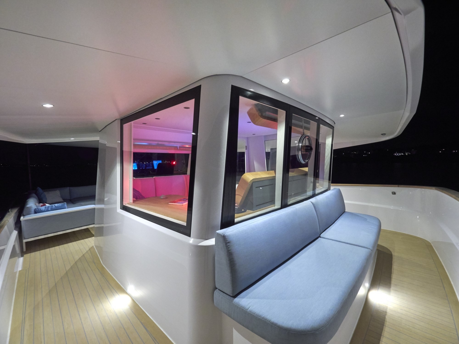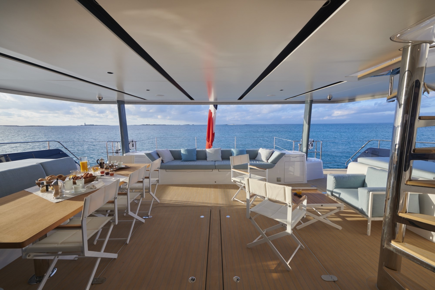 The main aft deck is divided between a lounge, a dining area with a table for 8 persons and sunpads on both sides. A long seat separates the main aft deck from the hydraulic platform. It can be fully protected from disturbed weather, creating an additional indoor space.