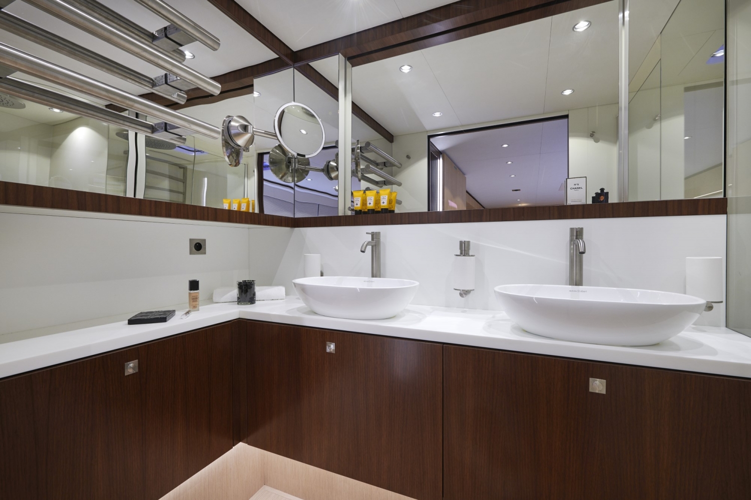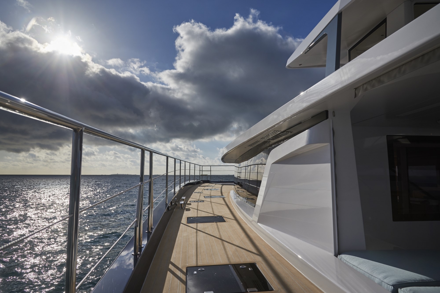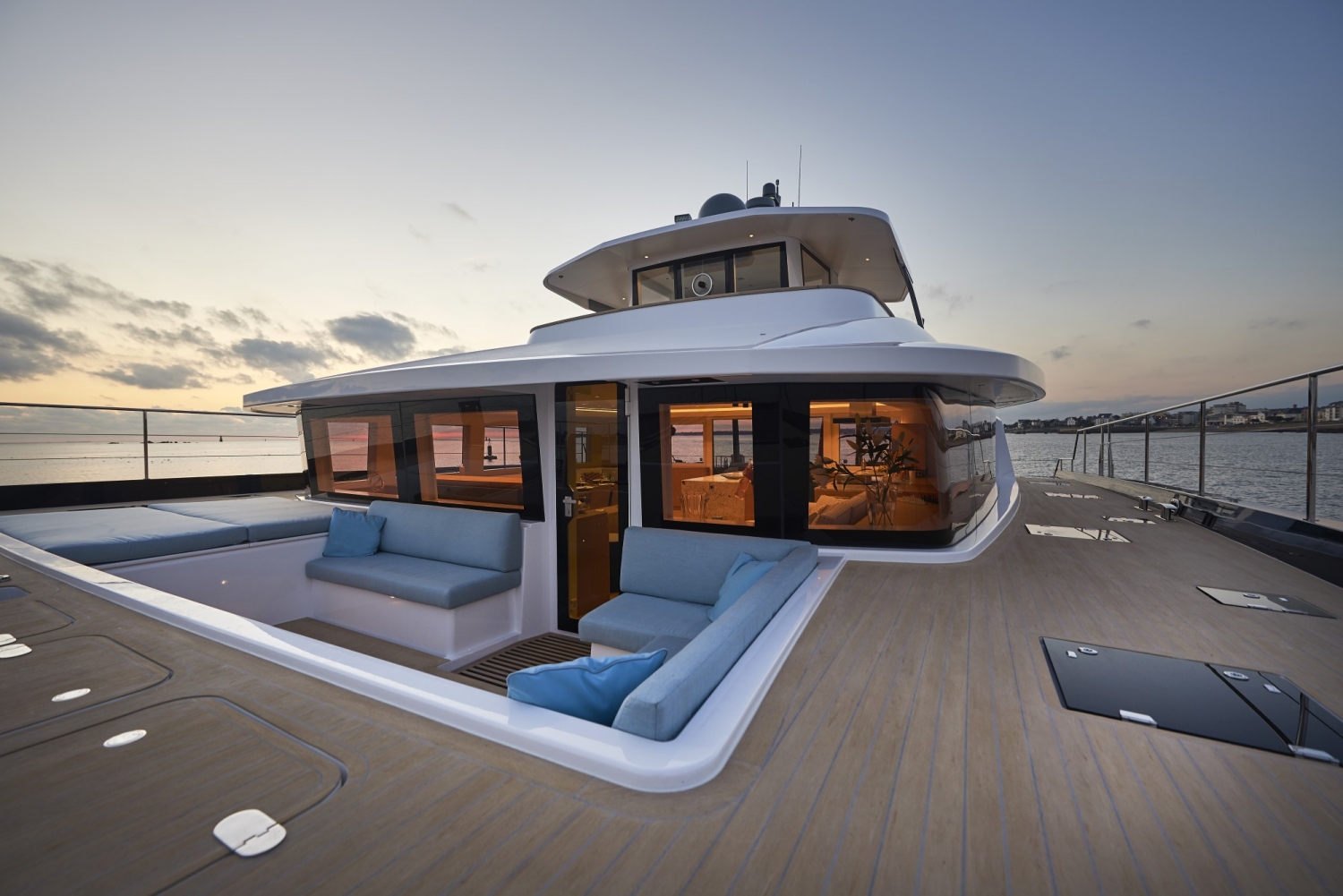 The main aft deck is divided between a lounge, a dining area with a table for 8 persons and sunpads on both sides. A long seat separates the main aft deck from the hydraulic platform. It can be fully protected from disturbed weather, creating an additional indoor space.
