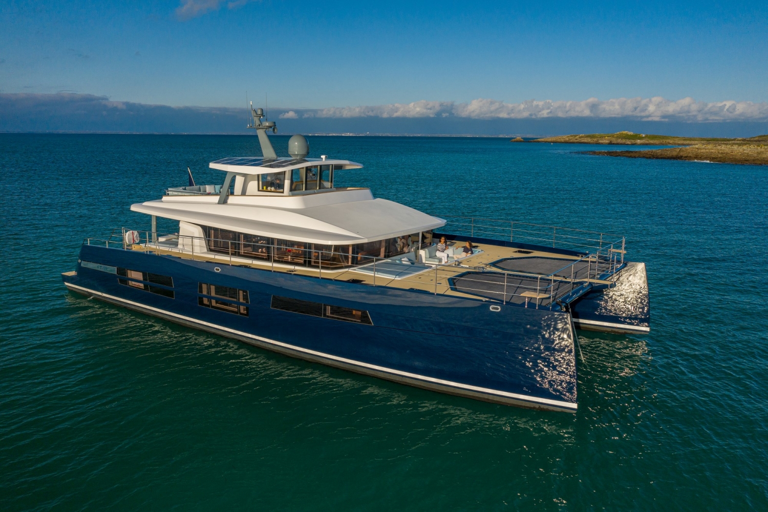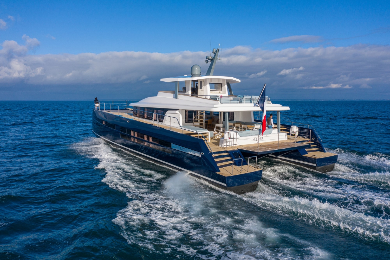 The aluminum hulls and composite structure & superstructures are designed to travel the world. This cruising yacht evolves at a cruising speed of 12 knots with a maximum speed of 18 knots.