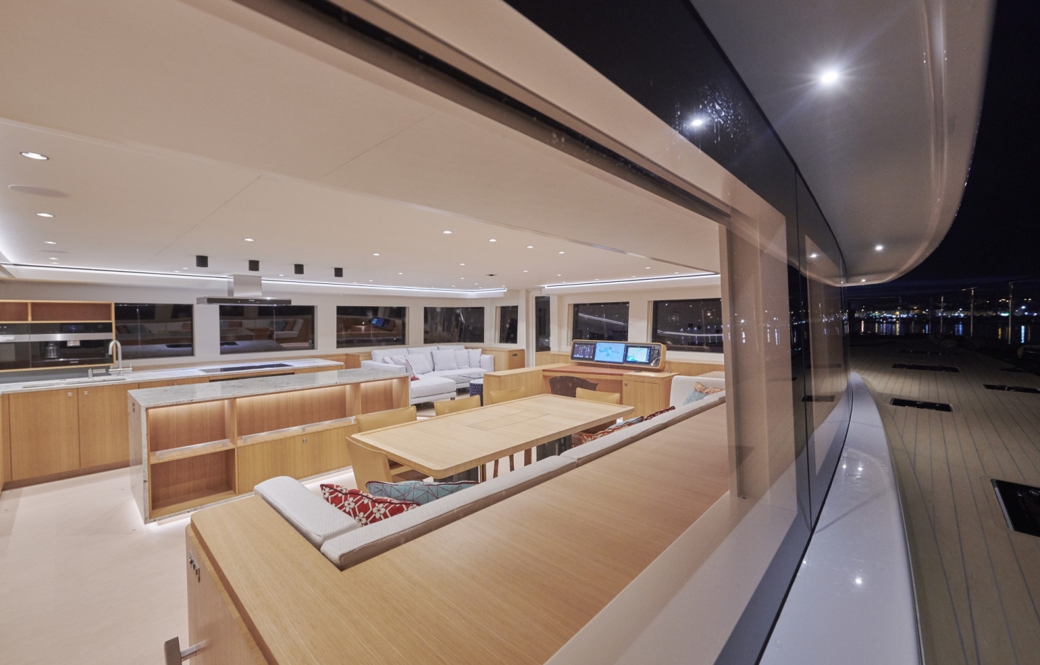 Travelling with a Long Island Power is a whole new experience, with amazing sea sight wherever you are on board.Beyond an uninterrupted ocean view, the catamaran features a natural stability, equally navigating and mooring, allowing to live on board in comfort and serenity. The deck surface adds a lot of living spaces. The Long Island Power 78’ main deck offers a lounge area and a sea water bath, providing a safer alternative to sea bathing. This relaxing space is directly connected to the saloon, creating a continuity and blurring the lines between interior and exterior. This combination brings a breathable and smooth circulation on board, multiple spaces can be enjoyed in various ways, creating a peaceful retreat or a welcoming spot for a family or friends gathering.