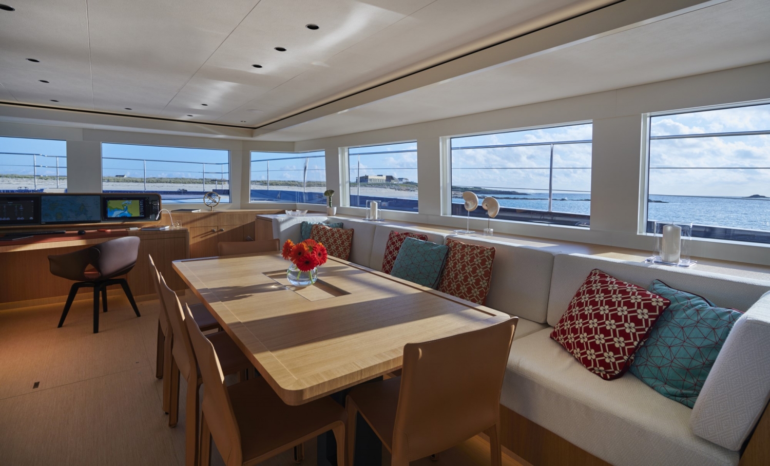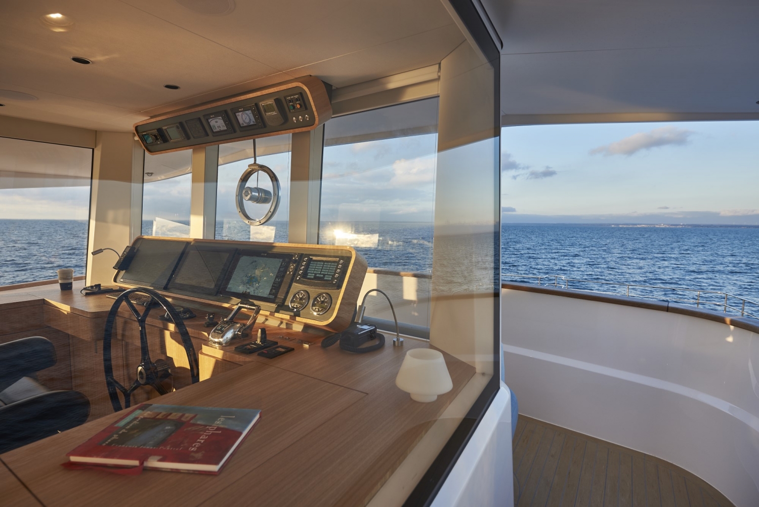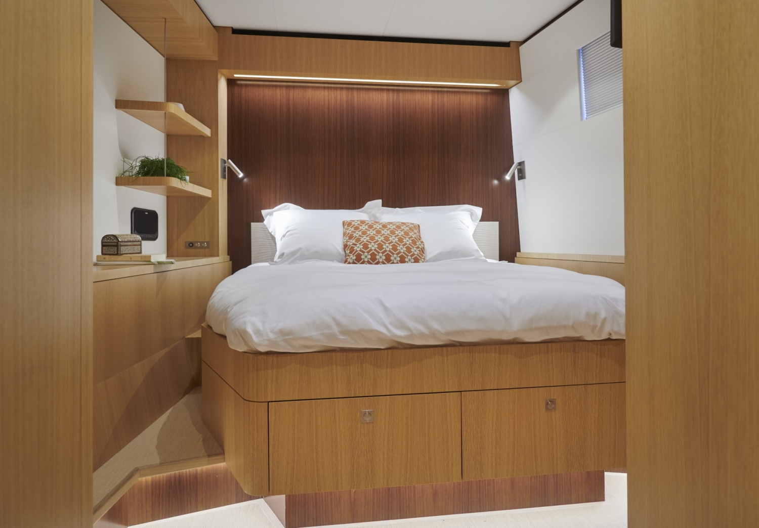 The voluminous indoor spaces are flooded with natural light and immediately makes you feel at home. The warm and rich selected woods (oak and walnut) complement the welcoming and serene atmosphere. With 132 square meters of living area, this boat has a lot to offer. The main space is comprised of a galley, main saloon, dining area and a desk. A large central island made of granite separates the spaces.